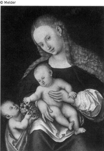 Tafelmalerei: Bild: Maria sitzt oder thront, das Christuskind sitzt auf ihrem rechten Knie & Johannes der Täufer als Kind in Madonnendarstellungen (N.B.: nur sekundäre Notationen); Maria (Jungfrau); Christuskind; Knie; stehen; rechts & Johannes der Täufer (Heiliger); Kind; Signatur: Links unten: Geflügelkte Schlange (Piktogramm); Maße: 77 x 57 cm