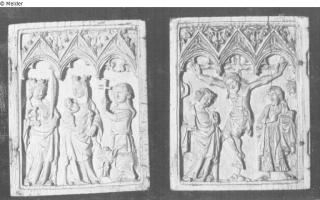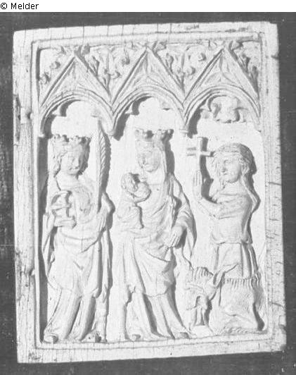 Maria mit Kind zwischen zwei heiligen Frauen. Elfenbeinrelief unter drei gotischen Baldachinen; Helbing: Maria mit dem Kind, stehend, links heilige Katharina, rechts Margarete, kniend, ein Kreuz in den Händen. Drei Masswerkbogen. Beinrelief. Scharniere fehlen