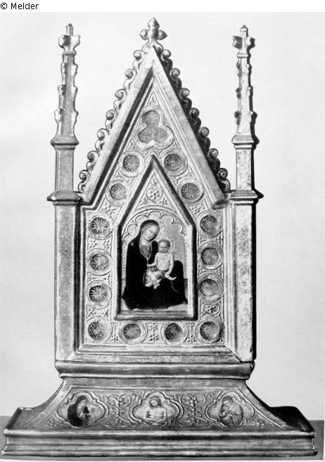 Reliquienbehälter. In gotischer Rahmung Maria mit dem Kind; unten, am Sockel, nebeneinander in Vierpässen Maria, Christus als Schmerzensmann und Johannes Ev.Goldgrund. ; Literatur: Abbildung Versteigerungskatalog Tafel 1; vergleiche Milanesi, Doc. Sen. I., Seite 33; Harck, archivio st. dell' arte, 1889, Seite 206