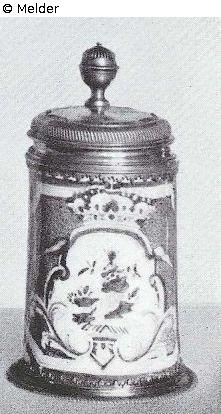 mit Zinndeckel und -fuß, manganbraun, gesprenkelter Fond mit Blaudekor, auf der Stirnseite Barockkartusche, darüber Krone