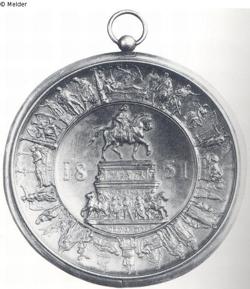 RS.: Reiterdenkmal Friedrichs II. mit dem Datum der Denkmalenthüllung; Inschrift 1851 DEN 31. MAI; Im Medaillenrand sind ca. vierzig weitere Werke des Bildhauers dargestellt