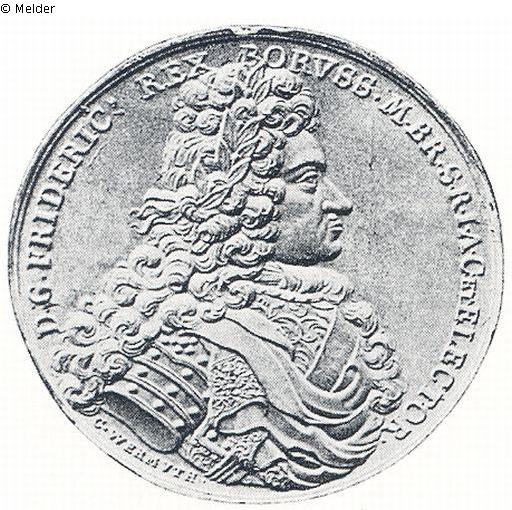 Vs.: Brustbild König Friedrichs I.; Umschrift: D · G · FRIDERIC · REX BORVSS · M · BR · S · R · I · A · C · ET ELECTOR · (Signatur) C · WERMUTH ·