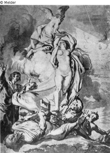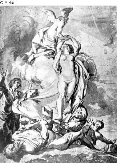 Studie zum Gemälde: Merkur entführt das Glück. Kopenhagen, Statens Museum for Kunst. Kopie von S. Lammers (?). Dresden, Kupferstichkabinett (Inventarnummer C 5732). Signatur: Rechts unten: N. Knüpfer. Pinsel in Braun.