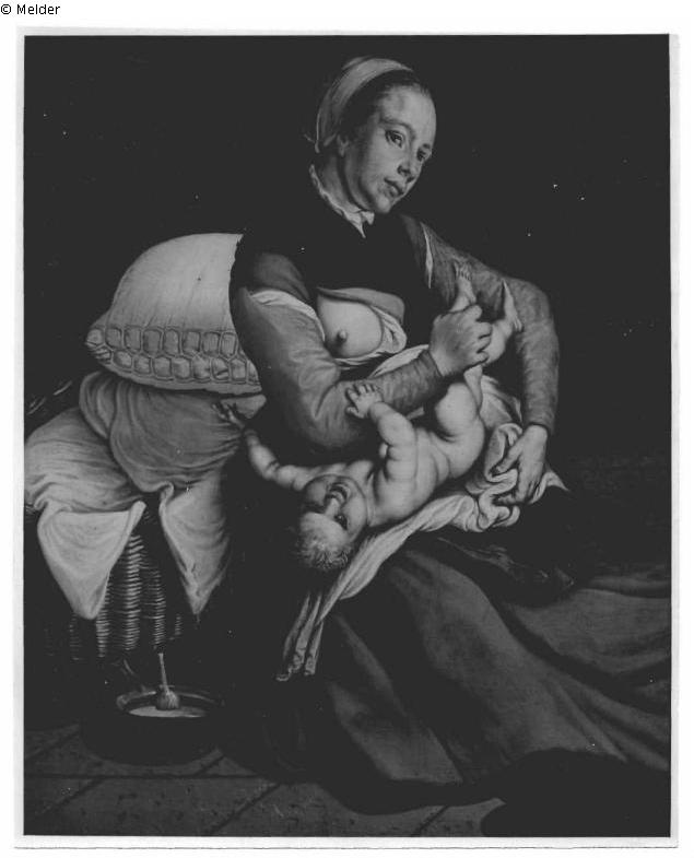 Mutter mit Kind, in ganzer Figur sitzend, mit entblößter Brust wird das nackte Kind trockengelegt;