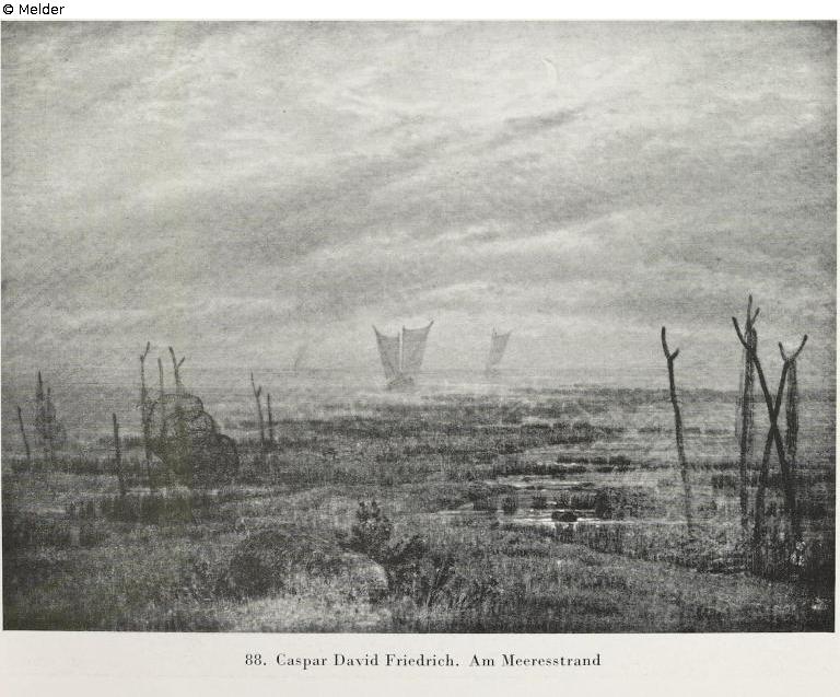 Mondnacht am Meeresstrand. Im Vordergrund aufgehängte Fischernetze, in der Ferne drei Segelboote. Um 1808 entstanden. Abgebildet bei K. K. Eberlein: C. D. Friedrich, Tafel 74