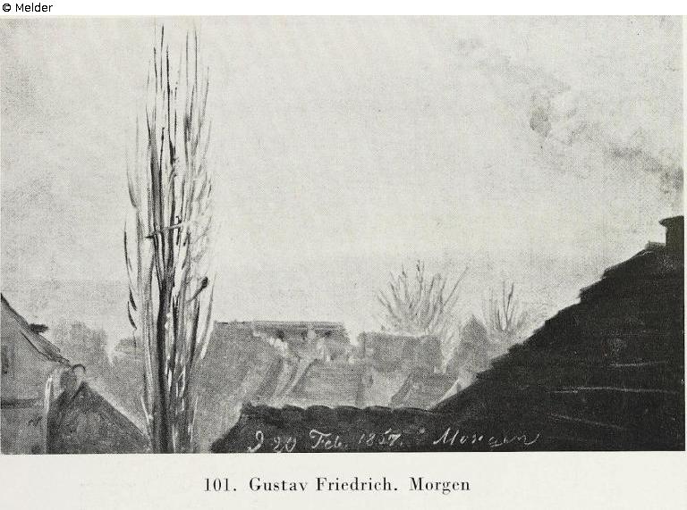 Blick aus dem Fenster auf Hausdächer und Bäume. Unten bezeichnet: "d. 20. Feb. 1857, Morgen". Abgebildet bei W. Wolfradt: Caspar David Friedrich, S. 184.
