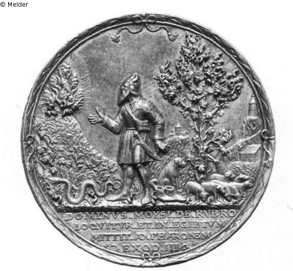Medaille. Vs.: Moses steht in einer hügeligen Landschaft vor dem brennenden Dornbusch. Vor seinen Füßen windet sich eine Schlange. Hinter ihm unter einem Baum hütet sein Hund die Schafherde. Laubwerk und Gräser sind aufgelötet. Inschrift im Abschnitt: DOMINVS MOYSI DE RVBRO / LOQVITVR ET IN EGIPTVM / MITTIT AD PHARONEM / EXOD III (Interpunktion: Dreiecke). Ringsum ein Blattrand mit Schleifen an den vier Seiten. Rs.: Anbetung der Könige. Inschrift: INVENERVNT PVERVM CVM MARIA / ADORAVERVNT ET OBTVLE / RVNT MVNERA AVRVM / THVS ET MIRRA / MAT II (Interpunktion: Dreiecke). Unten die Jahreszahl M D X X X VIII. Am Trog die Signatur HR (ligiert).