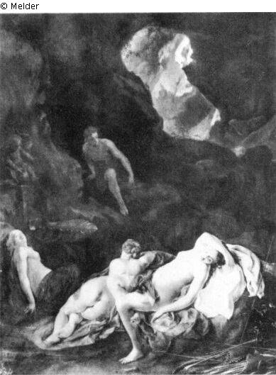 In a rocky grotto are three nymphs, sleeping on coverings and a youth, sneaking up to the nymphs. To the right is a fountain in form of a shell with a cupid. Signed with initials on the quiver with arrows in lower left corner.