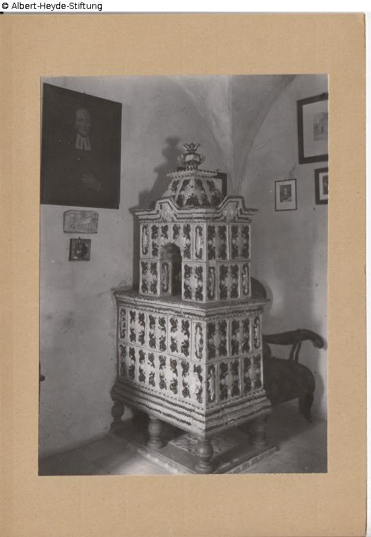 Barocker Ofen in der "Sakristei" im Erdgeschoss der ehem. Gubener Stadtmuseums. Rechts an der Wand ein Bildnis des Komponisten geistlicher Lieder Johann Crüger.