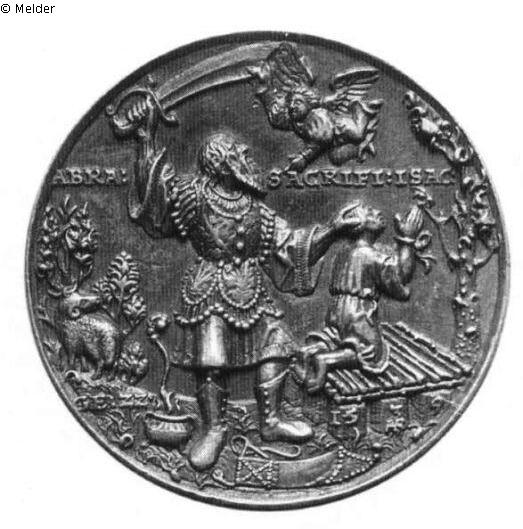 Medaille. Vs.: Abraham hat den Kopf seines mit gefesselten Händen auf dem Altar knienden Sohnes ergriffen und schwingt mit der Rechten das Krummschwert, das ein heranschwebender Engel festhält. Zu seinen Füßen liegen die Schwertscheide und der Opfertopf. Links vor Büschen sieht man den Widder, rechts einen Baum. Blattwerk und Gräser sind nachträglich aufgelötet worden. An den Füßen des Altars die Jahreszahl 15 3 9 und die Signatur HR (ligiert). Inschrift im Feld ABRA : SACRIFI : ISAC und links unten GE : ZZ ?Rs.: Wie bei Nr. 366 Kreuzigung Christi nach dem Buchsmodell von 1536 (Nr. 361), aber statt der Kirche auf der linken Seite Aufrichtung der ehernen Schlange. Inschrift: MIS ERERE NO BIS DOMI NE , Signatur: HR (ligiert).