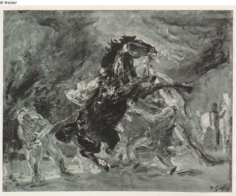 „1913 schreibt Eduard Fuchs an Max Slevogt: >Ich liege auf meiner Chaiselongue in meinem Arbeitszimmer und träume. Über mir bäumt sich der Hengst<. Die Gewitterszene aus dem vorstehenden Gemälde (MS 32) wird jetzt herangezoomt. Im Mittelpunkt ein fast auf den Hinterbeinen stehender Rappe, der verängstigt vom Gewittergrollen und einschlagenden Blitzen sich nicht mehr beruhigen lässt. Zwei Rossknechte versuchen ihn an den Zügeln wieder auf den Boden zu bringen. Zwei weitere Helfer versuchen ebenfalls ihr Glück – vergebens. Paul Westheim notiert zu dieser Momentaufnahme: >Diese kleinformatigen, von Blitzen überzuckten Tafeln Slevogts – ein Hengst, der pechschwarz aufsteigt … sind ein unvergleichliches schönes Feuerwerk“<. Am rechten Bildrand steht ein Schimmel, der gestreichelt wird und sich wieder beruhigt hat, die Harmonie zwischen Tier und Mensch wurde wiederhergestellt“. (UW)