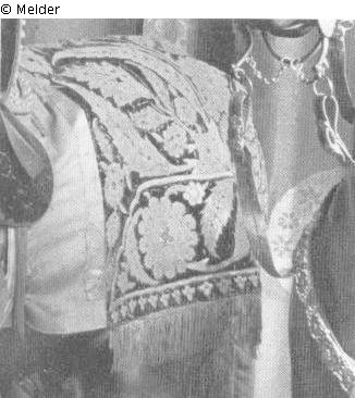 Reitzeuge - Der vordere Teil der aus zwei Stücken zusammengesetzten Decke besteht aus gelbem Atlas mit blauem Leinenfutter. Der hintere Teil stammt von einer türkischen Schabracke aus rotem Samt, die mit großen goldenen Blumen bestickt ist. Der hintere Teil ist an drei Seiten mit silbernen und goldenen Fransen besetzt.