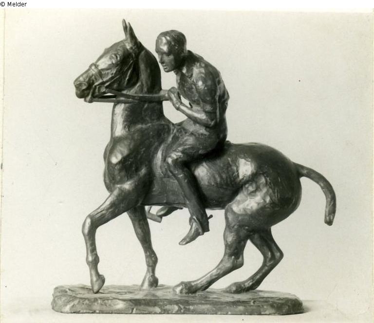 Der Reiter, in Stiefeln, Hose, Hemd, barhaupt, die Hände mit Handschuhen geschützt, sitzt mit vorgebeugtem Oberkörper, die augen scharf auf den Ball gerichtet. Er zieht mit der L. die Zügel straff an, so dass das Pferd plötzlich in seiner Bewegung innehält; die R. fasst den Griff des lagen Hammers. Die Bewegungen von Tier und Reiter sind mit vollendeter Sachkenntnis wiedergegeben, der Augenblick des gehemmten Vorstürmens bei dem Pferd und der scharfen Aufmerksamkeit bei dem Reiter mit Sicherheit als der einzige erkannt, in dem das bewegte Spiel plastisch dargestellt ist.