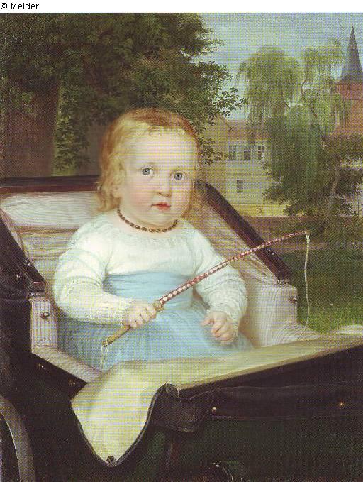 Portait eines Kindes mit blondem Haar und in einem Kinderwagen sitzend, es trägt ein hellblau, weißes Kleid und eine braune Halskette. In der rechten Hand hält es eine kleine Peitsche. Im Hintergrund ist das Schloß König zu sehen. Unten rechts Monogramm und Datum: AH 1841.