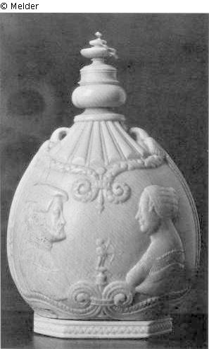 Pulverbüchse mit aufgeschrobenem Verschluß und zwei Ösen zum Hängen. Auf der Vorderseite flaches Relief: Brustbilder eines Ehepaares, dazwischen ein kleiner Amor mit gespanntem Bogen.