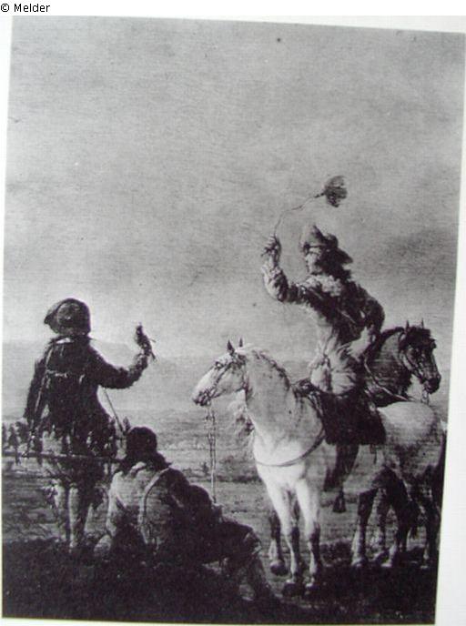 Rast bei der Falkenjagd. Im Vordergrund einer Landschaft eine Gruppe von zwei Pferden und drei Männern, vowon der eine noch zu Pferde einen Lockvogel schwingt. Der andere barhäuptig im Gras sitzt und seinen Schimmel am Zügel hält, während der dritte, ein Falkner, auf dessen Hand eine Falke sitzt, vom Rücken gesehen ist und eine Stange umgehängt hat auf der noch eine Anzahl Falken sitz; unsigniert