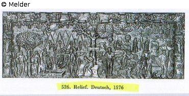Relief, Holz, geschnitzt und bemalt, mit den von links nach rechts fortlaufenden Darstellungen: Adam und Eva mit der Schlange, Ecce Homo, der verlorene Sohn, der auferstandene Christus. Als Begrenzung: Karyatiden. In einer zweiten Reliefzone: Bäume, Zelte, weitere biblische Szenen: die Kreuzigung, die Verkündigung. Oben: Wolken mit Engeln, Früchten, Löwenfratze und Moses mit der Gesetzestafel. Unten datiert 1576. Gerahmt.