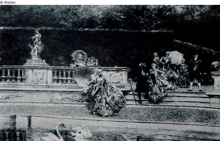 Die Gesellschaft kommt die Terrasse zum Wasser herab. Unten Schwäne; G.-R.; signiert; Scène galante (Probably the Parc de Versailles) (Bosquet des Dômes?)