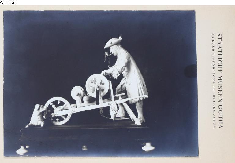 Scherenschleifer mit Karren und Hund auf einem Gestell aus schwarzem Holz mit Elfenbeinfüßen. Der Schleifer raucht eine Pfeife, deren Deckel an einem zarten, vom Gothaer Drechslermeister Jusatz gefertigten Kettchen herabhängt. Am Gestell signiert mit "CALük".