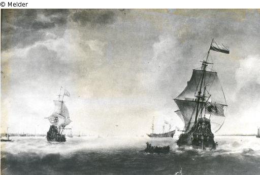 Maße mit Rahmen; "Das größte Schiff zeigt am Heck das vollständige Wappen von Amsterdam. Die große Flagge, rot-weiß-blau, ist die eines 'Admirals', d. h. eines Befehlshabers eines Esquadres, nicht die des Großadmirals der ganzen Flotte. Die kleinere Flagge, welche vom Heck abweht (...), ist die allgemein bekannte sog. 'Blutflagge', welche auch mit den Buchstaben P P P, d. h. Pugno pro Patria (ich streite fürs Vaterland) vorkommt. (...) Der Maler hat beabsichtigt, eine Vorstellung zu geben von einigen malerischen Schiffen und keineswegs irgendwo eine Kriegshandlung. (...) Es kommt mir vor, daß das Gemälde aus der früheren Periode von V. de Velde stammt, d. h. vor dem Jahre 1665, also in Friedenszeiten, nicht in der späteren und keineswegs nach 1672, als der Maler seinem Vater in England und in englischem Dienst war." (Expertise von J. F. L. De Balbian Verster, Amsterdam, 1933)
