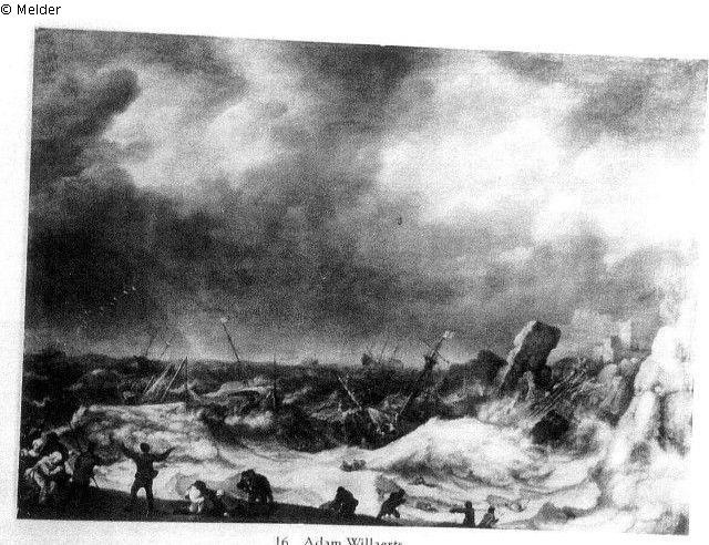 Rechts Klippen und eine Burg. Im Mittelgrund mehrere Schiffe, von Wellen überschlagen. Im Vordergrund Terrainstück mit Geretteten. Bezeichnet: A.W. Ft. 1636