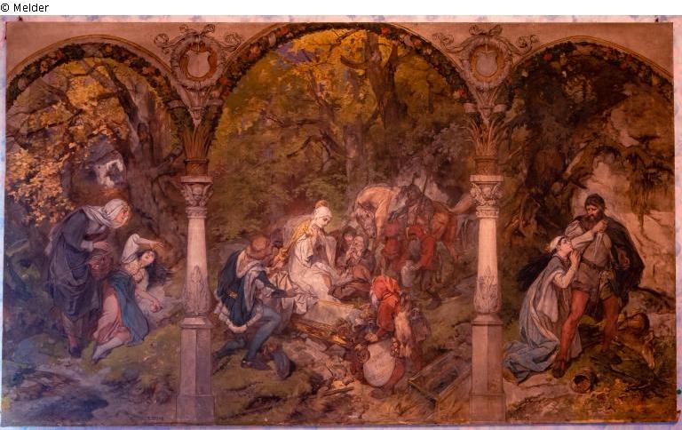 Unter drei gemalten Architektur-Bögen zeigt das Gemälde drei Szenen aus dem Märchen "Schneewittchen": links: Schneewittchen liegend mit dem vergifteten Apfel, bez. u.r.: E. OEHME; Mitte: Schneewittchen im Glassarg, der Prinz und die sieben Zwerge, bez. u.r.: E. OEHME; rechts: Schneewittchen und der Jäger. bez. u.l.: E. OEHME.