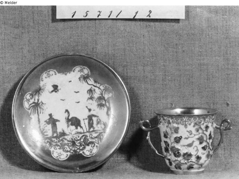 Supplement Oppenheimer: Auf der Tasse ein vielfarbiger Traubenzweig im Relief an der Unterkante der Tasse, Untertasse innen und beide Ohren vergoldet, auf der Untertasse Chinesen und ein Kamel auf goldenen Grund. Keine Marke.