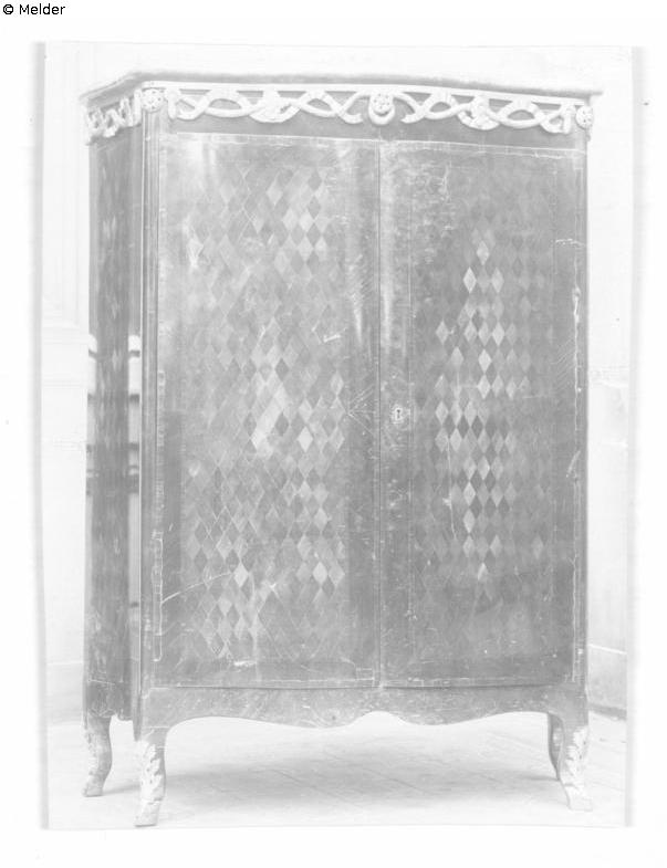 klein mit zwei Türen. Beschriftung der Rückseite des Fotos: Schrank „Seite 4 Lot 8, Höhe 1,30 m, Breite 0,95 m, Tiefe 0,40 m“. Quelle: Liste, der im Ausland beschlagnahmten Kunstgegenstände. In: D - LAB, B Rep. 025-04, Nr. 671/ 57.