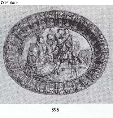 oval, farbig dekoriert, im Fond fürstliche Familie in Relief, auf dem Rand radial angeordnete kleine Felder, die durch Schuppenbordüre getrennt sind, mit Palmetten und Blumen