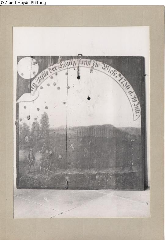 Nahezu quadratische Schützenscheibe mit dem Motiv eines Ackerbürgers beim Überwachen der Heuernte im Gubener Umland. Dazu die Legende: „…n Defd. der König sucht die Wiese. 1780 d. 19. Juni“.