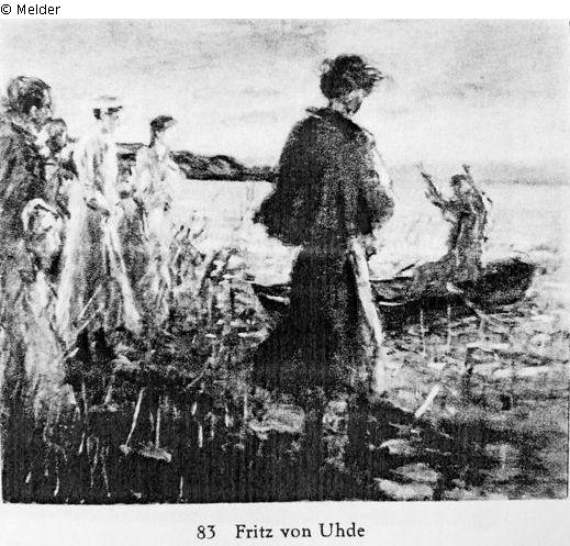Seepredigt. Ufer, Kahn, Christus mit erhobenen Händen zu links stehendem Volk sprechend. Untergehende Sonne, Abendhimmel. Junge Andächtige vom Licht gestreift. Links unten bezeichnet: F.v.Uhde