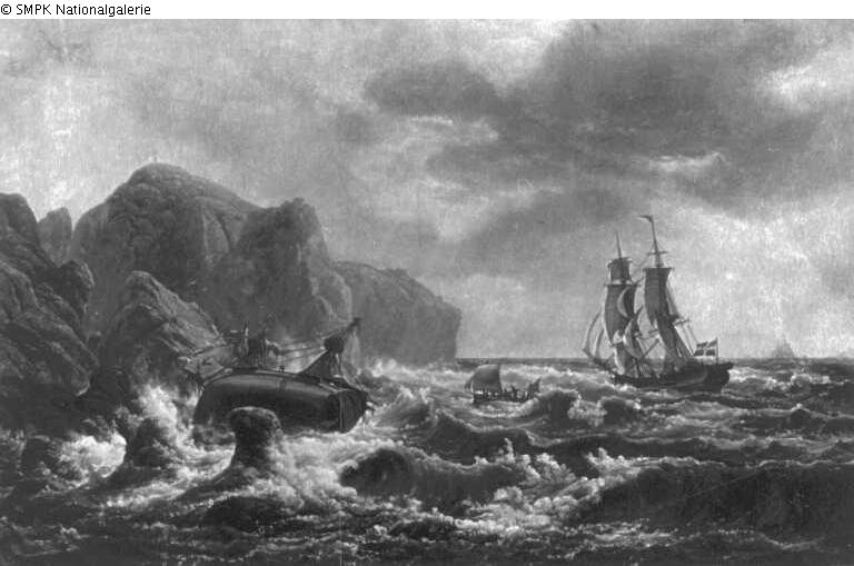 Tafelmalerei: Bild: Felsküste & Seesturm & Schiffbruch; Schiffswrack & Segelschiffe: Brigg