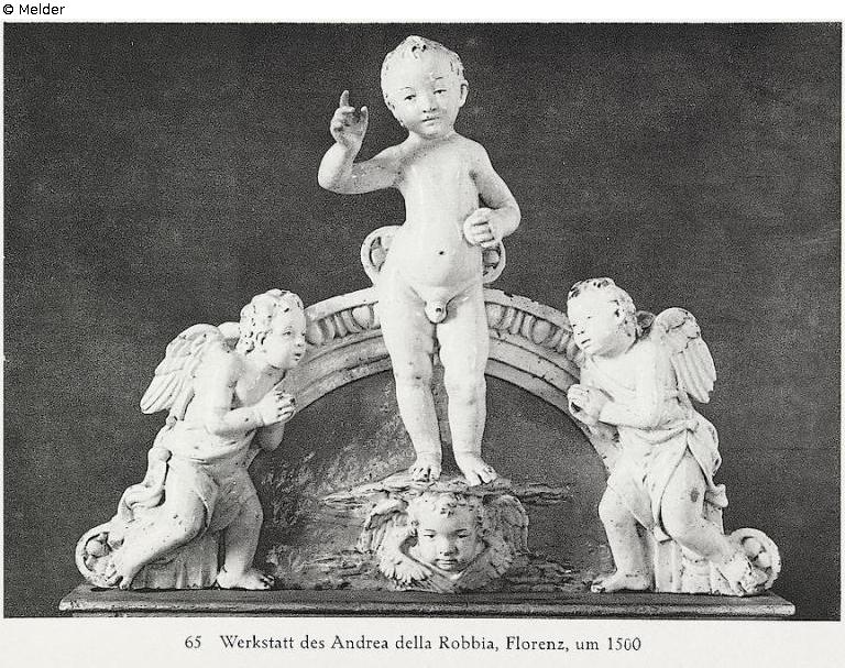 In halbkreisförmigem Feld geflügelter Engelskopf in Wolken, auf denen der Christusknabe steht. Rechts und links ihn anbetende, halbbekleidete Engel. Terrakotta-Relief, glasiert, hauptsächlich weiß, Grund des Bogenfeldes blau, in den Wolken etwas grün und gelb. Quelle: Hugo Helbing Kunsthandlung und Kunstversteigerungshaus: Kunstbesitz eines Berliner Sammlers. Katalog Nr. 49. (DOI: Externer Link)