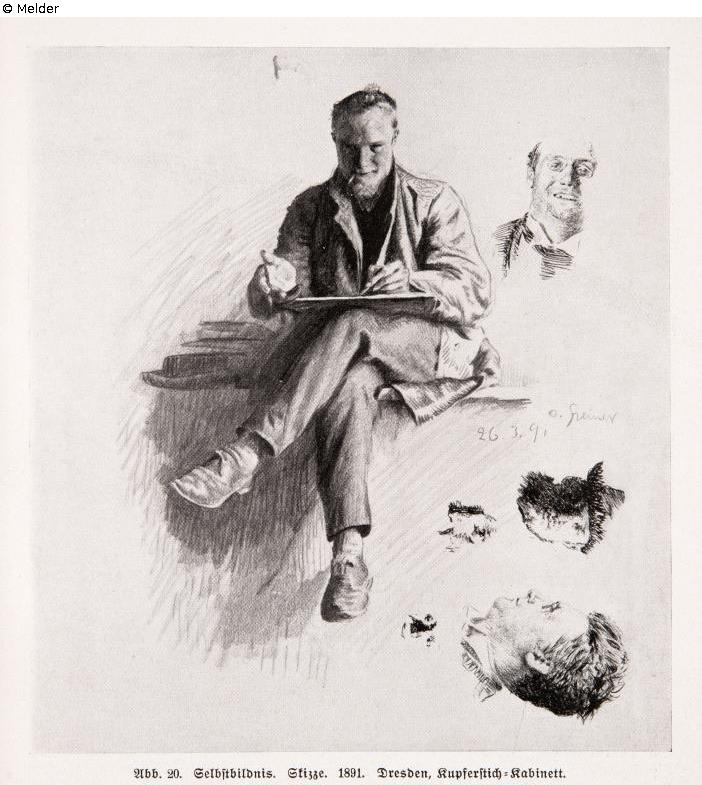Der Zeichner ist von vorn dargestellt, sitzend und mit dem Zeichenblock auf den Knien. Rechts zwei Bildnisstudien des Kammersängers Gerhäuser/Meyer und eine des Künstlers. Signatur: Rechts: Otto Greiner 26.3.91.