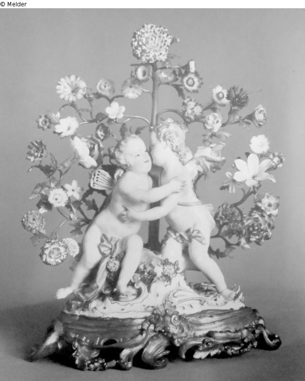 Porzellangruppe in Fassung aus vergoldeter Bronze mit Porzellanblumen