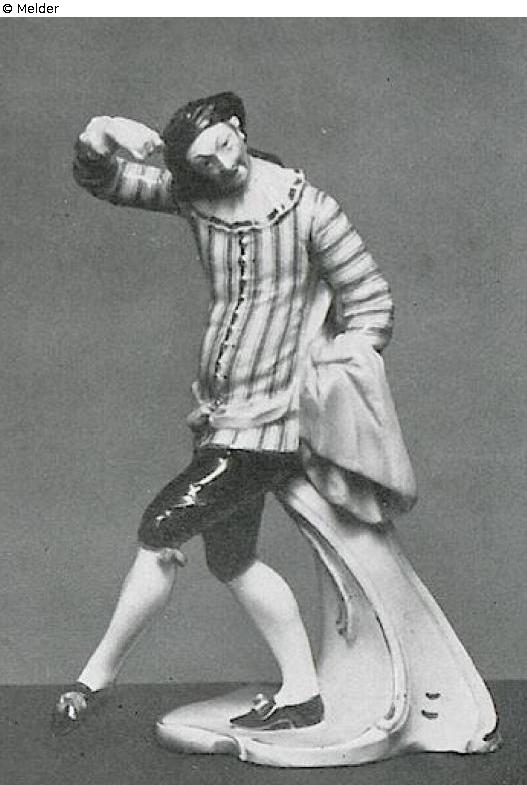 Skaramuz der italienischen Komödie. Tanzend hat er den linken Fuß gehoben. Mit der rechten Hand greift er an sein Barett. Mit der linken Hand rafft er seinen Mantel. Schwarzes Barett, goldbesetztes, blauweiß gestreiftes Wams mit weißer Halskrause und gelber Schärpe, schwarze Kniehosen und Schuhe mit eisenroten Bändern, weiße Strümpfe. Die Rocaillen der Sockelstütze und des Sockels sind goldgehöht. Eingepreßter Weckenschild (sichtbar an der Sockelstütze). Modell von Franz Anton Bustelli