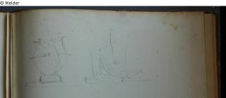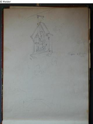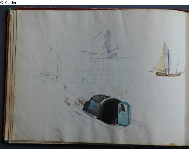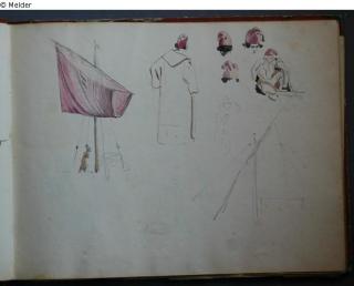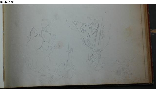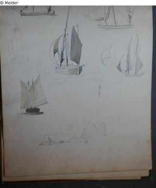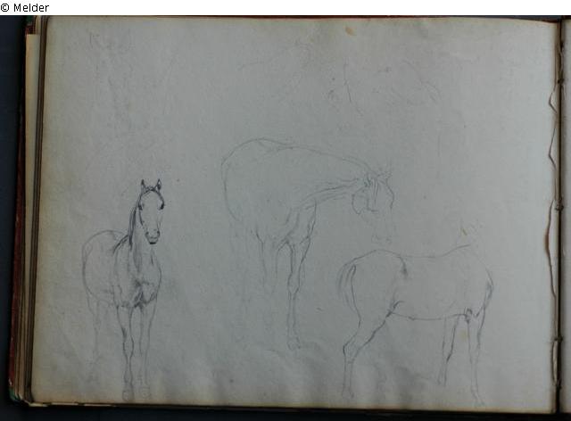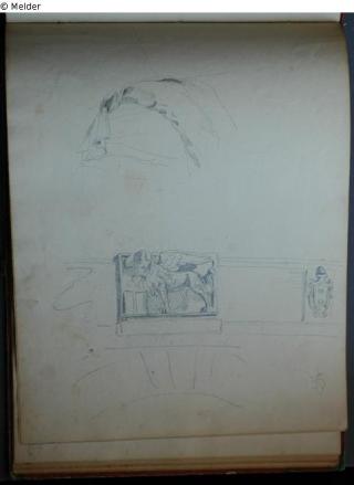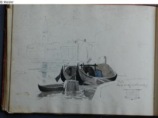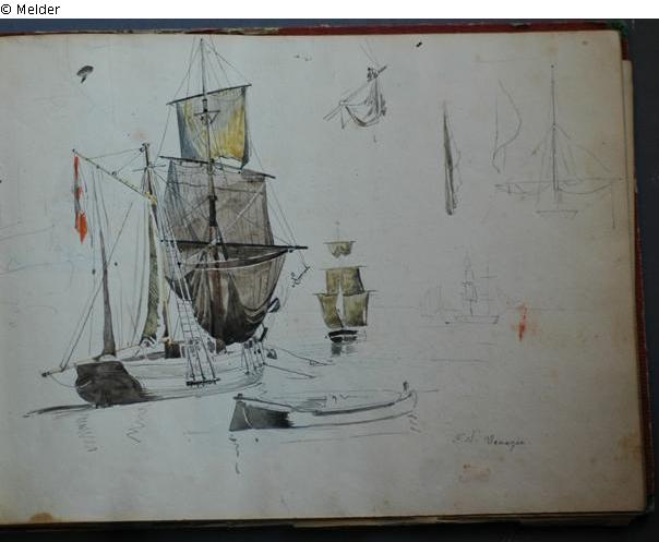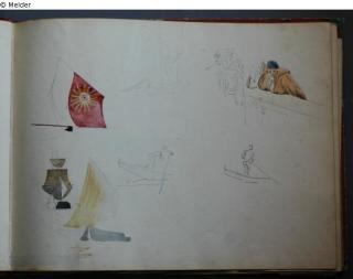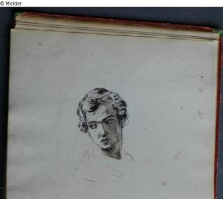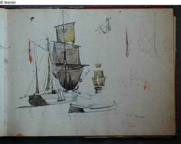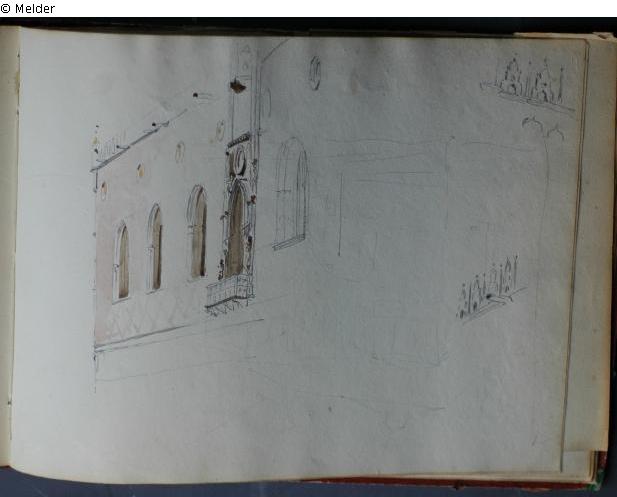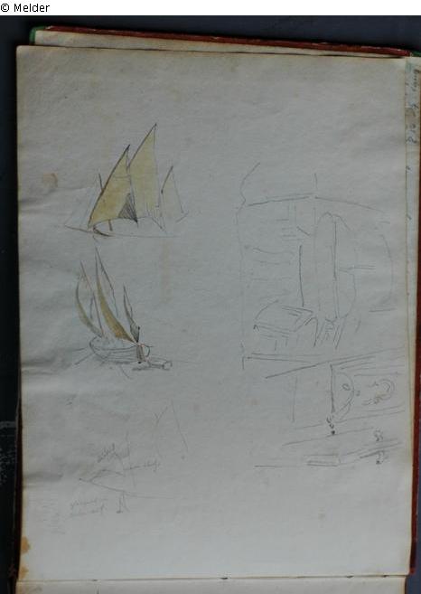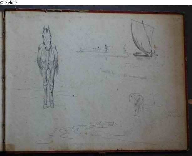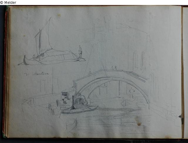 Motive überwiegend in Venedig gezeichnet; roter Pappeinband mit durchgestoßenen grünen Ecken und roter Lederrücken mit weißem Vorsatzpapier; landschaftliche Skizzen, Tier- und Figurenstudien und andere Skizzen.