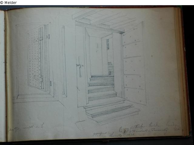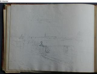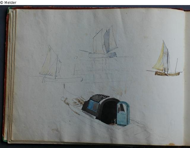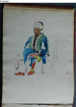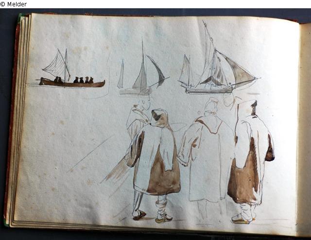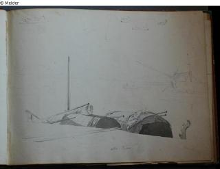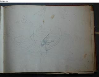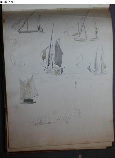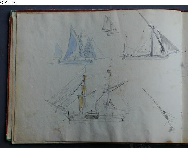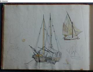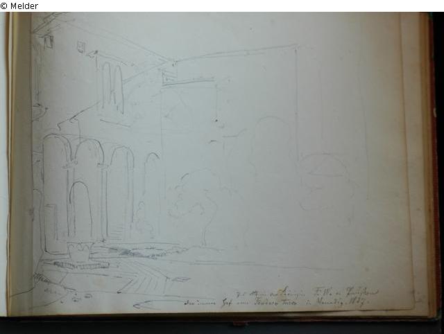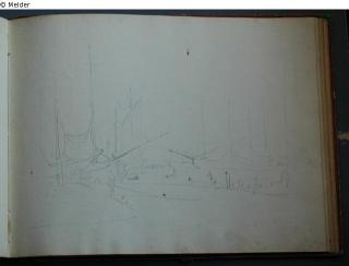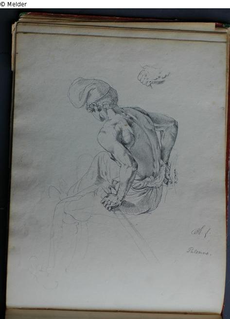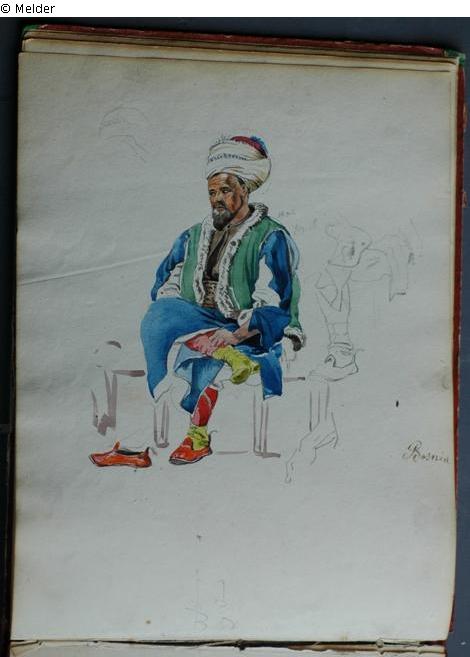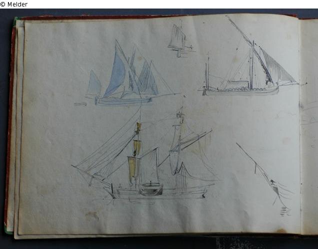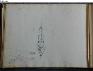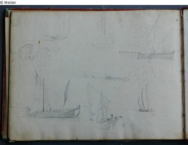 Motive überwiegend in Venedig gezeichnet; roter Pappeinband mit durchgestoßenen grünen Ecken und roter Lederrücken mit weißem Vorsatzpapier; landschaftliche Skizzen, Tier- und Figurenstudien und andere Skizzen.