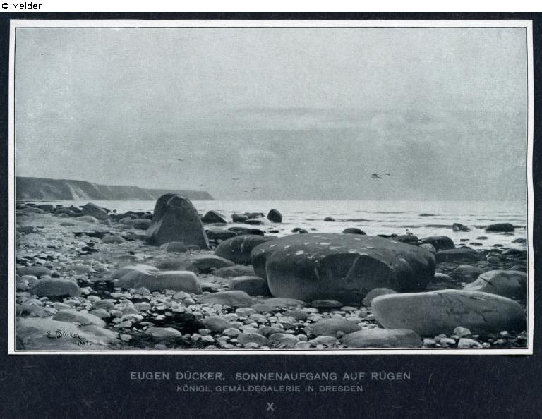 Bez. unten links: E. Drücker 1887. Vorn der Strand mit großen Steinblöcken, links die Küste, rechts die Ostsee. Nur Dünungswellen branden an den Klippen. Hinter einer grauen Nebelbank steht die rote Scheibe der aufgegangenen Sonne. Das Meer strahlt die Morgenhelligkeit silberweiß zurück. Nur Möwen beleben die Strandeinsamkeit.