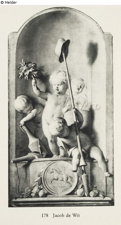 Ein Putto einen Zweig hochhaltend, ein zweiter mit langem Speer, an dem eine Mütze aufgespießt ist, und zwei andere stehen in einer Nische. Am ist Sockel Medaillon mit springendem Pferd, darum ein Fruchtkranz.