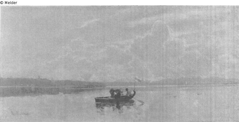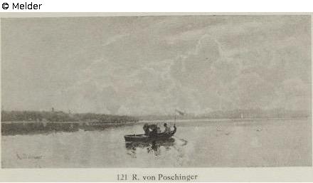 Ein Kahn mit bayerischer Fahne mit drei Personen an Bord rudert gegen Seeshaupt. Bez. l. u.: R. v. Poschinger, Goldrahmen.