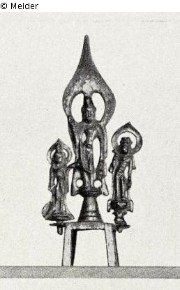 auf vierfüßigem Sockel, mit zwei Adoranten, mit herzförmigen Gloriolen. Feuervergoldet. In gelbem Stoffkasten. China. Tang.