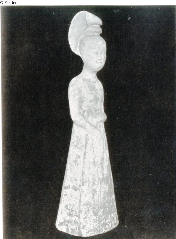 Sammlung Eduard Fuchs erworben zwischen 1912-1922 und in dessen Besitz dort bis 1933; 25.10.1933 Beschlagnahmung durch die Gestapo; zwangsweiser Verkauf (Zahlung Reichsfluchtsteuer) durch seine Tochter Gertraud Fuchs: Versteigerung Auktionshaus Rudolph Lepke Berlin, Katalog 2115; S. 17 - am 15.10 und am 16.10. 1937 wurde diese Skulptur im Konvolut 212 versteigert: „ZWEI TONFIGUREN: a) stehende Frau mit Kappe“; unglasiert, H. 29 cm. b) stehende Frau mit Musikinstrument; gelblich glasiert. H. 21,5 cm (Beschädigt). Tang“. versteigert. Laut annotiertem Lepke-Katalog (Kunsthistorische Bibliothek, Den Haag) von dem Berliner Kunsthändler und Antiquar Curt Reinheldt, Lützowstraße 50, Berlin W 35 ersteigert für 18,- RM (Ohne Schätzpreis). Die Protokollabschrift der Versteigerung 2115 bei der Reichskammer für Bildende Künste vermerkt maschinenschriftlich „Reinheld[t]“ und bestätigt den Preis von 18,- RM (Landesarchiv Berlin, A Rep. 243-04 Reichskammer für bildende Künste – Landesleitung Berlin); Verbleib unbekannt