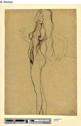 nach Werkverzeichnis Strobl, Nr. 773: Stehender weiblicher Akt nach links; schwarze Kreide, 451 : 315; Sign. re. u.: "Gustav Klimt" und bez.: "R"; Beethovenfries 1902 (Novotny-Dobai Nr. 127)
