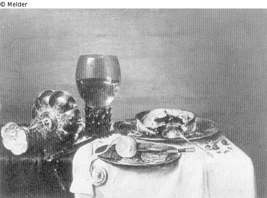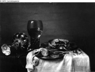Tafelmalerei: Bild: gedeckter Tisch als Stilleben & Weinglas, Römer; Tisch; Stilleben & Glas; Römer (Pokal); Signatur: Auf der Messerklinge: . HEDA . 1631; Maße: 55 x 75 cm