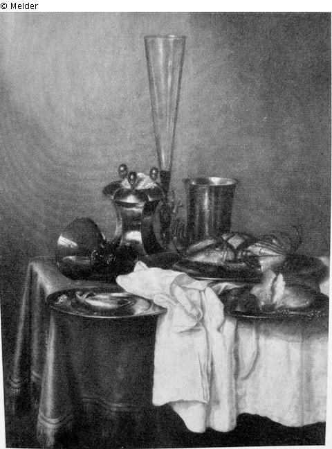 Auf einem zur Bildmitte hineingeschobenen Tisch, über den eine violette, fransengesäumter Decke fällt, ein großer Wollkrebs auf Silberschüssel, eine Silberkanne, ein Silberbecher, angebrochenes Brot und Gläser. Grauer, getönter Hintergrund. Bezeichnet auf dem Becher: W.Cl.Heda 1643; Literatur: Abbildung Versteigerungskatalog Tafel 24