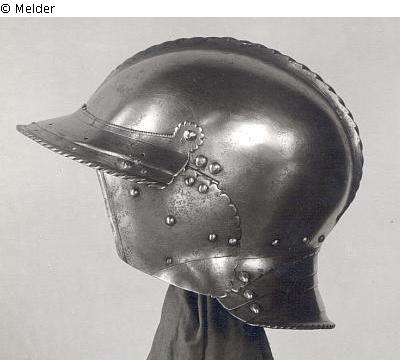 Längliche Glocke von gedrückter Form. Strickwulstförmiger Kamm. Nackenschirm rund, dreimal geschoben. Gestreckter Gesichtsschirm abwärts geneigt, spitz, aufschlächtig. Oberkante gezahnt, in der Mitte geschweift und ausgeschnitten. Futterlöcher paarweise. Die Ränder mit leicht vertieftem Band und Strickwulst. Die Backenstücke an Scharnieren, unten abgesetzt, mit gezahnter Oberkante. Gesamtgewicht: 1.150 g