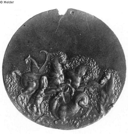 Runde Plakette, oben eine Durchbohrung, ein Stück am Rand ist ausgebrochen. Links liegt der nackte Phaeton kopfüber zwischen den Rädern seines zerbrochenen Wagens. Um ihn herum drängen sich die vier Pferde. Zwei liegen gestürzt, die anderen brechen wiehernd aus, alle haben gelockte Mähnen und Schweife. Links dahinter wird noch ein Stück des Wagens sichtbar. Die Plakette wurde einem Relief auf einem antiken Phaeton-Sarkophag in den Uffizien von Florenz nachgebildet. Das Motiv ist auch auf einer Onyx-Kamee des 16. Jahrhunderts in Florenz wiedergegeben. Auf anderen Exemplaren sieht man im Hintergrund eine Landschaft mit Bäumen oder eine Arena mit den Reliefs springender Pferde (Molinier 1886, Nr. 192; Bange 1922, Nr. 468). Die Musei Civici von Brescia besitzen eine Variante mit breitem Rand, der mit Sphingen und Trophäen geschmückt ist, und eine Plakette mit einem Reiterkampf, auf der die Pferde und der Gestürzte genau kopiert wurden (Rossi 1974, Nr. 52). Eine erweiterte rechteckige Version aus späterer Zeit (um 1550?) befindet sich im Britischen Museum in London. Wegen der Wellen im unteren Teil der Plakette deutete Pope-Hennessy die Szene als "Tod des Hippolytus".