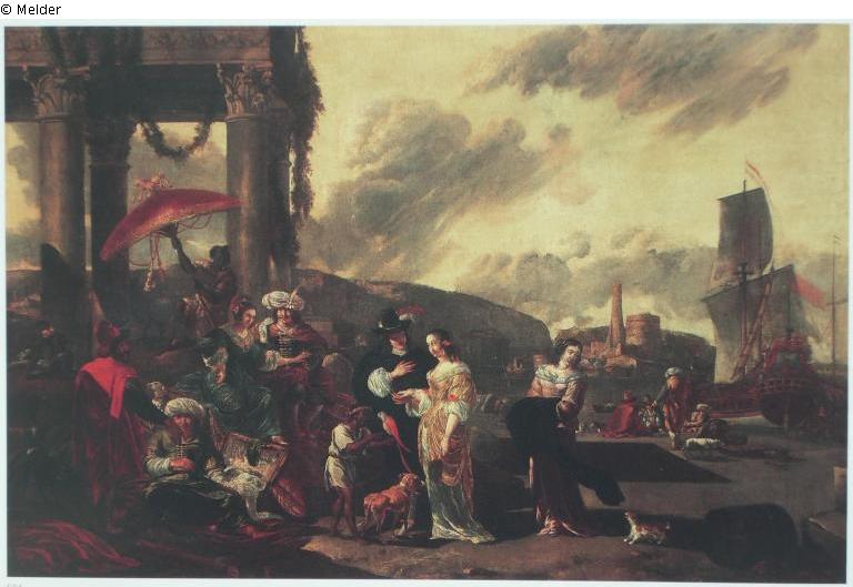 Südliche Hafenlandschaft mit Säulenarchitektur und reicher Staffage von Kaufherren mit ihren Frauen und Gefolge