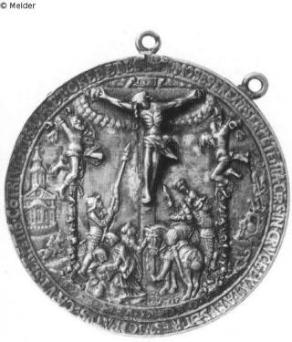 Medaille, dreifach gehenkelt (die linke Öse ist abgebrochen) mit Kette. Vs.: Adam und Eva stehen mit Äpfeln in den Händen unter dem Baum der Erkenntnis, um dessen Stamm sich die Schlange windet. Im Geäst sitzen ein Affe, ein Eichhorn und ein Hahn. Auf dem Boden hocken ein Einhorn, ein Ochse, ein Esel, eine Gans, ein Schwein, ein Hirsch und ein Hase. Seitlich erkennt man in kleineren Szenen die Erschaffung der Eva und die Vertreibung aus dem Paradies. Unten ein Spruchband mit IOANNS FRIDERICVS ELECTOR DVX SAXONIE FIERI FECIT, seitlich die sächsischen Wappenschilde. Am Baum wurde Blattwerk aufgelötet. Umschrift (teils in ligierten Buchstaben): ET SICVT IN ADAM OMNES MORIVNTVR ITA ET IN CHRISTVM OMNES VIVIFICABVNTVR VNVS QVISQVE IN ORDINE SVO. Rs.: In der Mitte erhebt sich das Kreuz Christi zwischen denen der beiden Schächer. Maria Magdalena umfaßt den Fuß des Kreuzes und Johannes stützt die zusammengesunkene Maria. Von links tritt ein Soldat mit Lanze heran, ein anderer bedroht mit der Keule den rechten Schächer. Der Hauptmann zu Pferde schaut zu Christus hinauf. Links im Hintergrund sieht man einen Reiter vor einer Kirche, rechts die Auferstehung Christi. Unten ein Schriftband mit SPES MEA IN DEO EST und darüber die Signatur HR (ligiert) und die Jahreszahl 1536. Umschrift (teils in ligierten Buchstaben und mit Abkürzungen): VT MOSES EREXIT SERPETE ITA CHRS IN CRVCE EXALTATVS ET RESVSCITATVS CAPVT SERPETIS COTRIVIT VT SALVARET CREDETES [Rosette] Die Medaille wurde nach dem Holzmodell (siehe Nr. 361) ausgeführt, aber mit einigen Veränderungen: Schriftbänder und Wappen sind gefüllt, Wolken wurden hinzugefügt und das Laubwerk und die fast vollplastische Figur Christi in der charakteristischen Manier Reinharts nachträglich aufgelötet. In der Kress Collection in Washington befindet sich ein bronzenes Exemplar.
